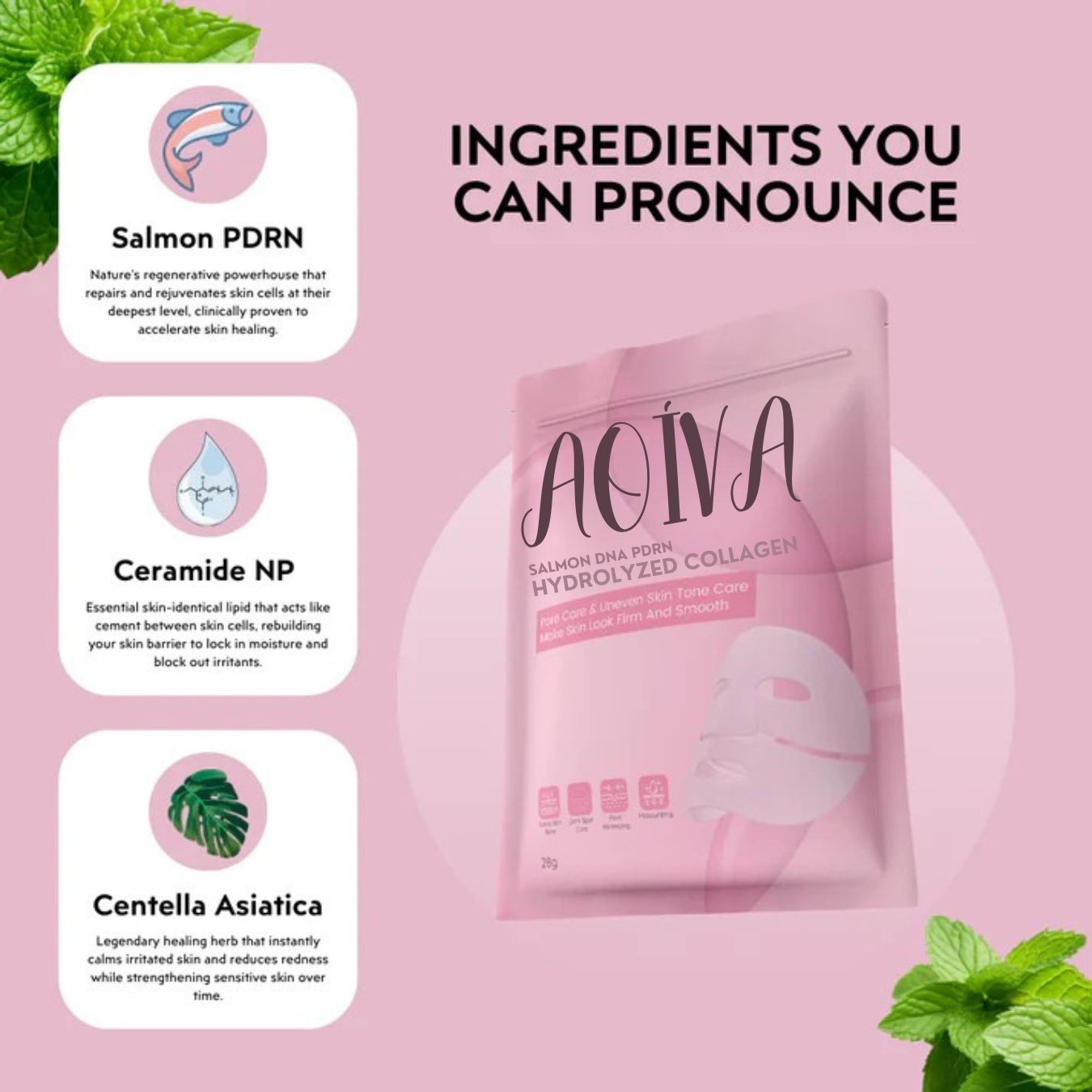 The mask is infused with Salmon DNA PDRN, collagen, and peptides that deeply penetrate the skin during the treatment. It starts as a pink gel and gradually turns transparent as your skin absorbs the active ingredients. This process helps rejuvenate, hydrate, and improve skin texture, leaving you with a glowing and plump complexion.